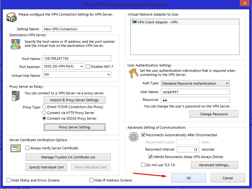 c. Pilih Conncet Via SOCK5 Proxy Server jika agan menggunakan Internet dengan SOCK5 Proxy contoh : SSH Tunnel.